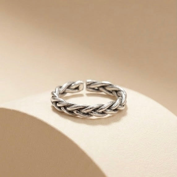 這款戒指以經典的**「麻花編織(Twisted Braid)」**工藝為設計主軸,透過銀線的交錯纏繞,呈現出如同繩索般堅韌而立體的紋理。
