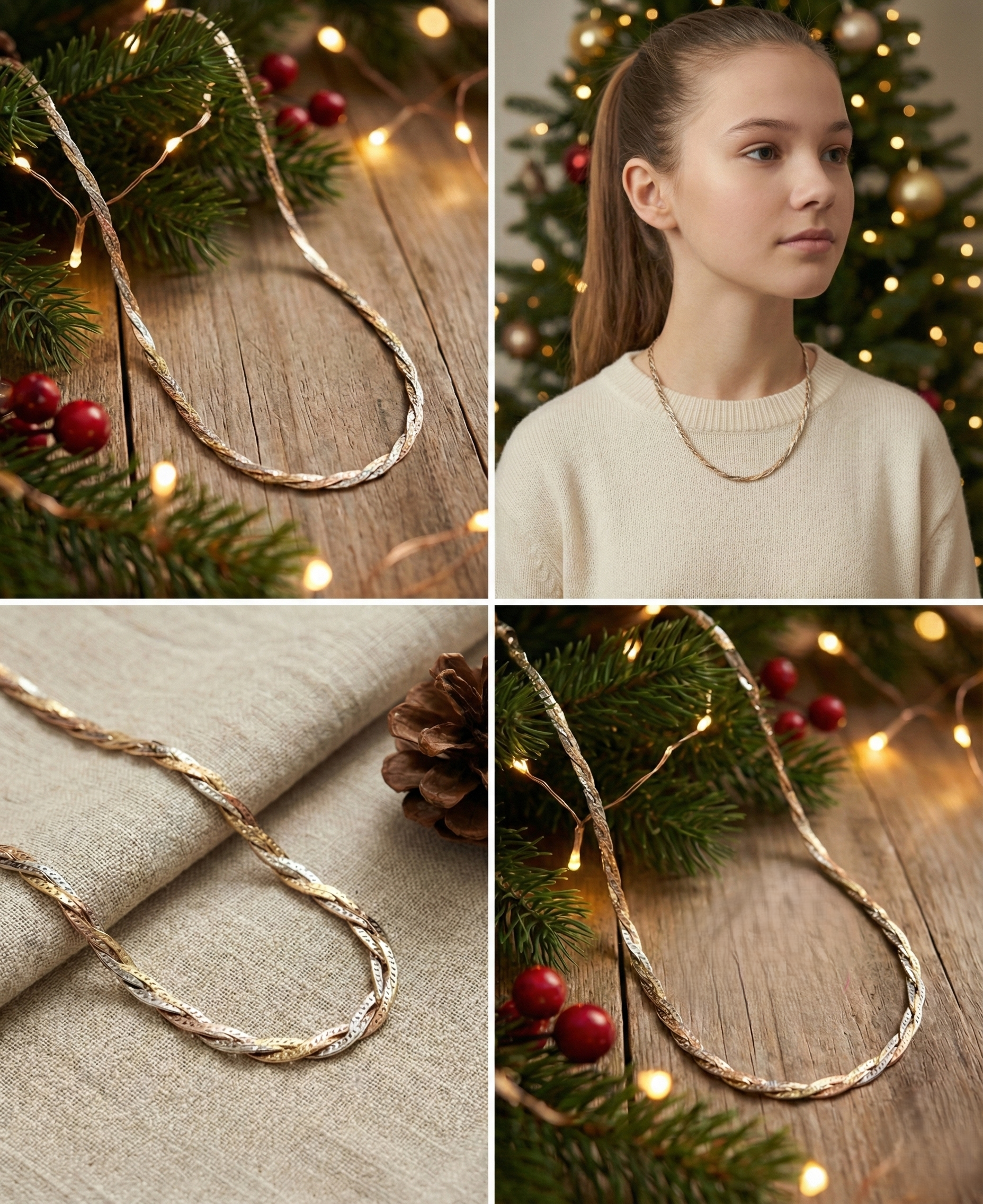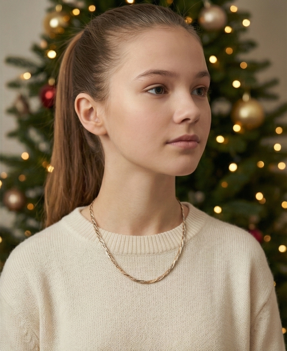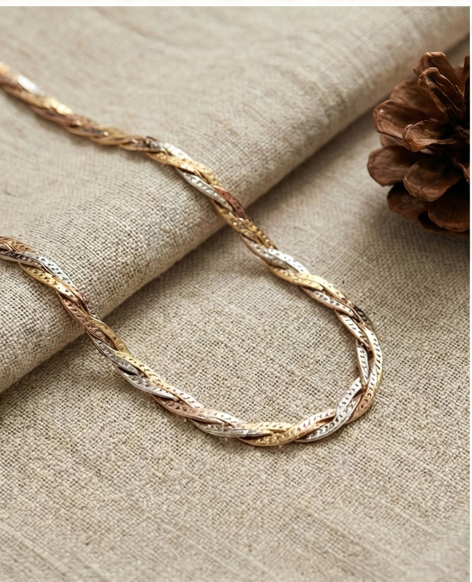 這款項鏈汲取經典的意大利編織工藝,三種色調完美交織。扁平的麻花結構如絲帶般流暢,表面採用獨特的鑽切紋理處理,隨光影流動呈現出如星塵般細膩璀璨的質感。它打破了金屬配色的界限,是一條能完美銜接您所有首飾收藏的萬能單品,展現出優雅而豐富的層次美學。
