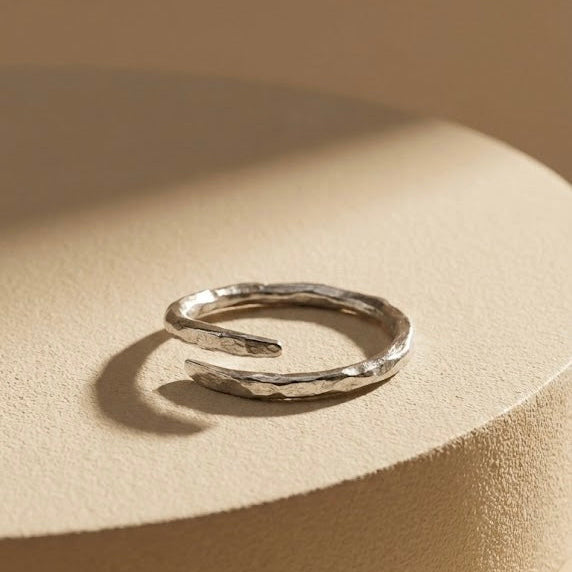 這種獨特的肌理設計,能捕捉來自四面八方的光線,在指間折射出如波光粼粼般的細碎光芒,宛如流動的水面般生動。戒指採用交錯式開口設計,兩端收尾處打磨得圓潤細緻,不僅佩戴舒適,更增添了一份隨性自在的氣息。它既沒有過度華麗的裝飾,卻憑藉著純粹的材質與工藝,展現出耐看且高級的「Wabi-Sabi(侘寂)」美學。