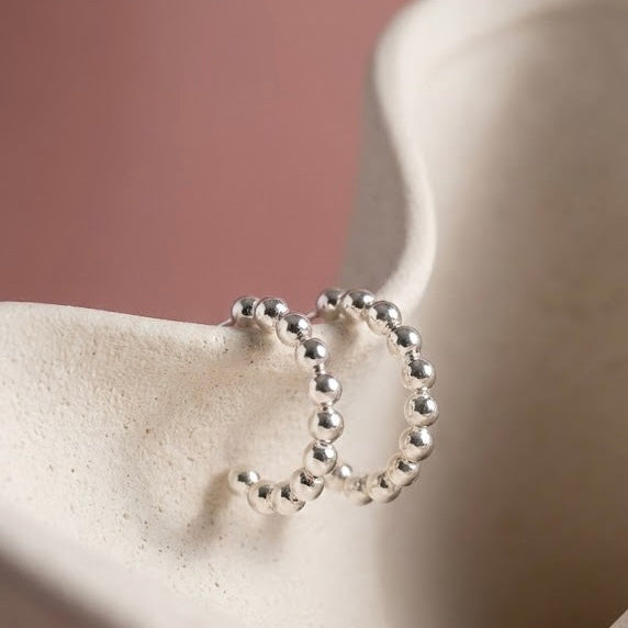 這款耳環打破了傳統圈式耳環的單調,採用了充滿趣味的連珠設計。由一顆顆圓潤飽滿的小銀珠緊密排列而成,形成一個優雅的 C 型圓弧。