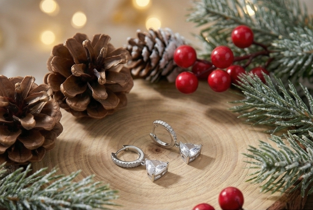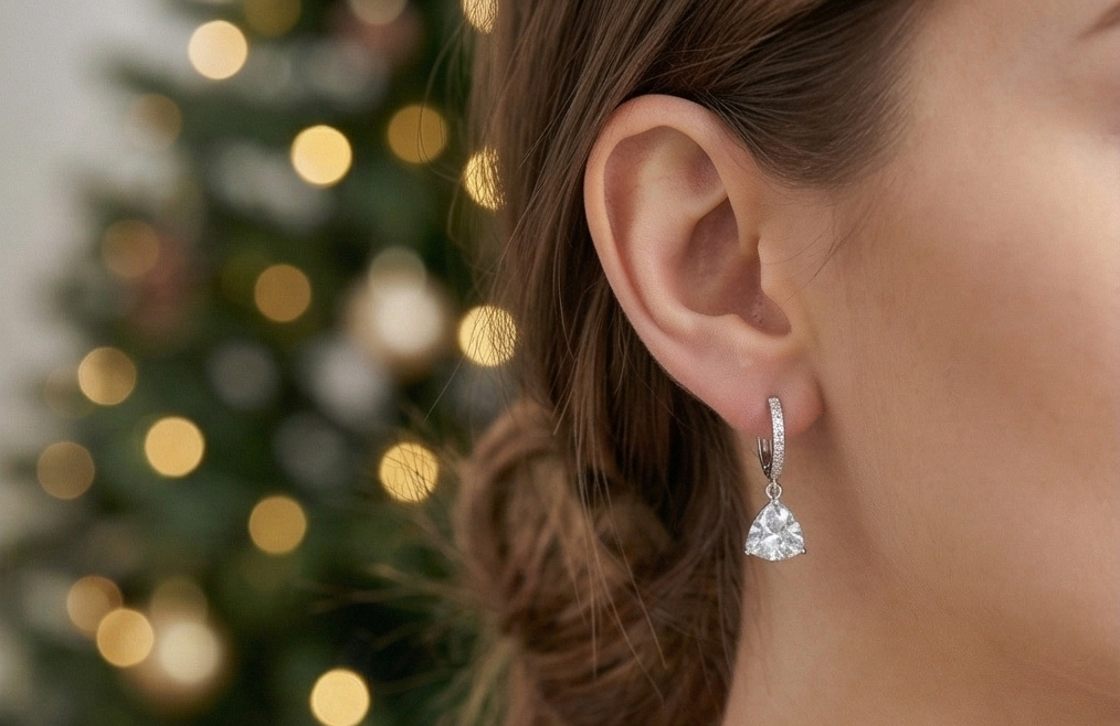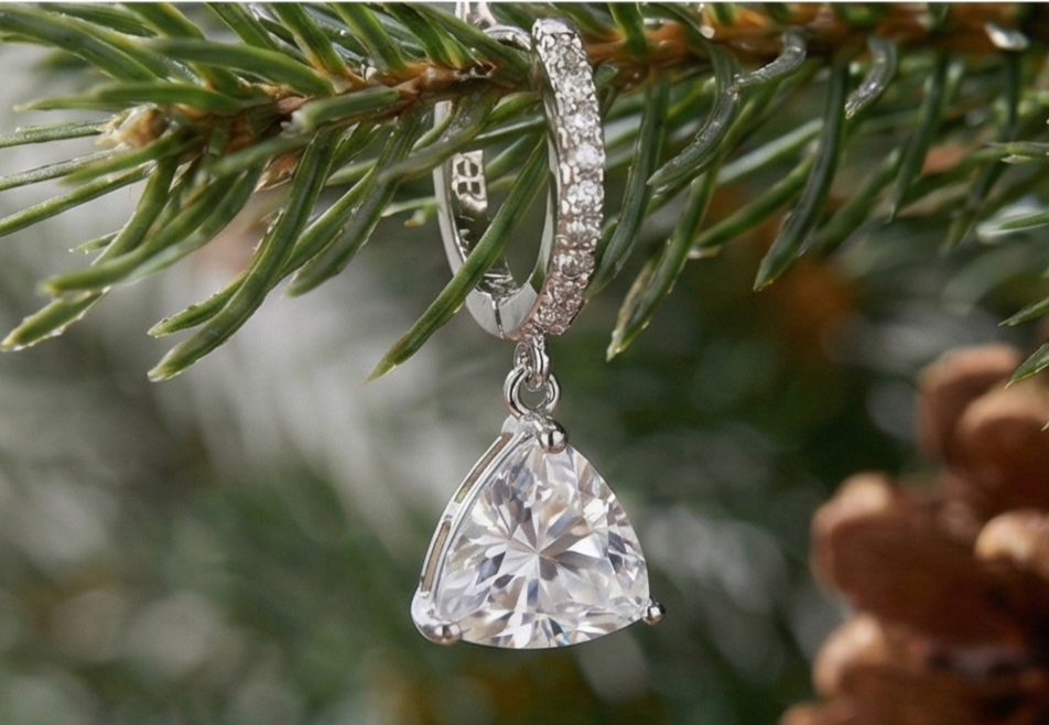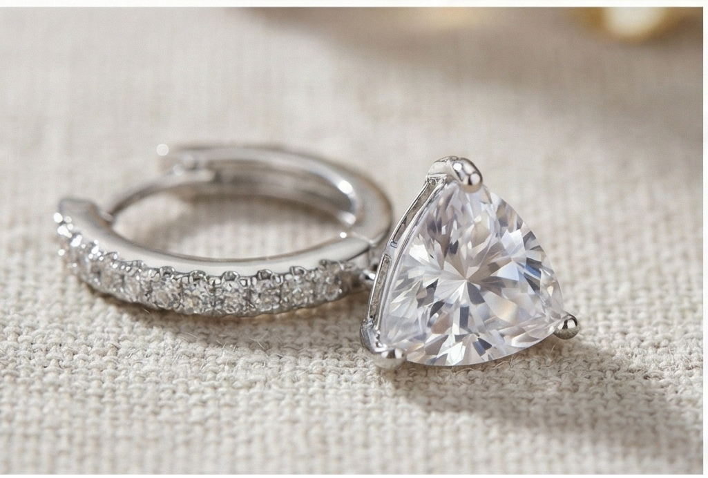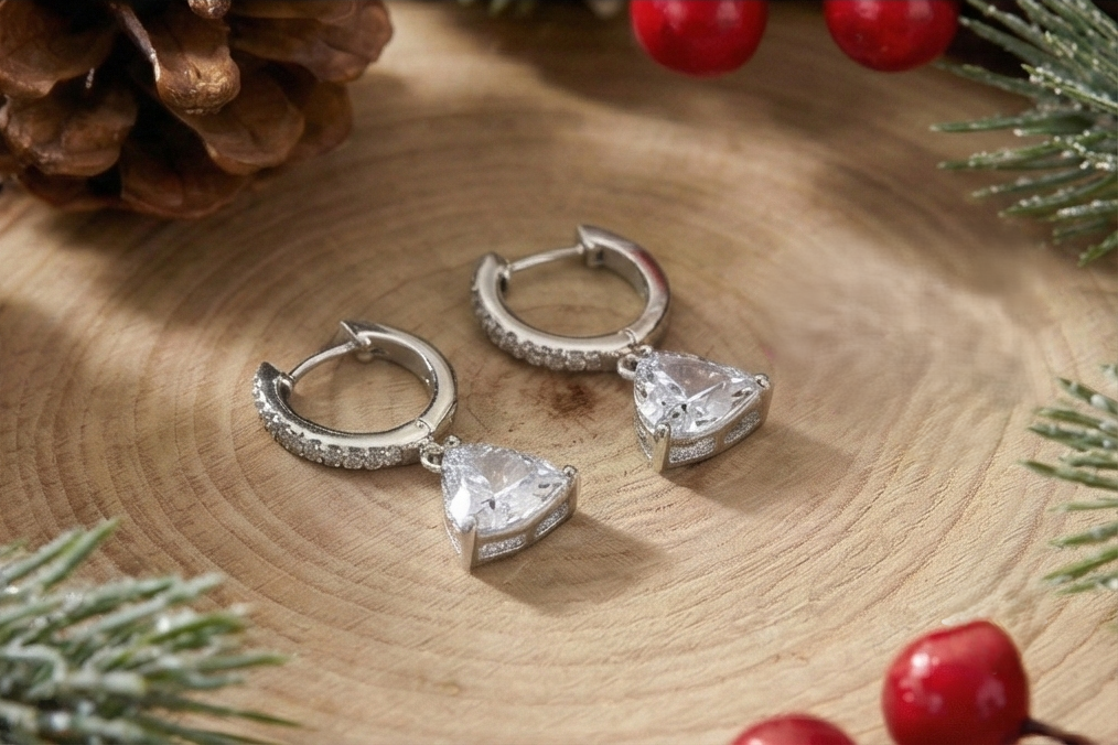這款耳環採用獨具現代感的三角工藝,打破傳統圓形或方形寶石的框架。倒三角的幾何線條能在此覺上產生延伸效果,巧妙修飾臉部輪廓。主石選用頂級鋯石,呈現出如北極光般冷冽而耀眼的火彩。搭配密鑲鋯石的純銀耳圈,營造出豐富的層次感,是兼具時尚個性與優雅氣質的進階單品。